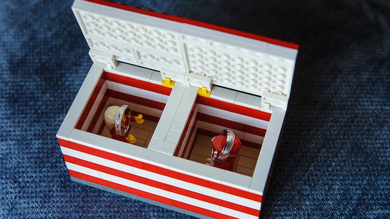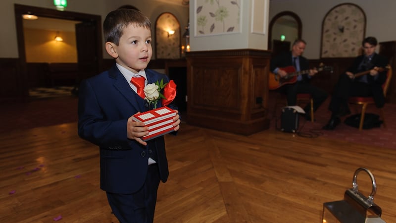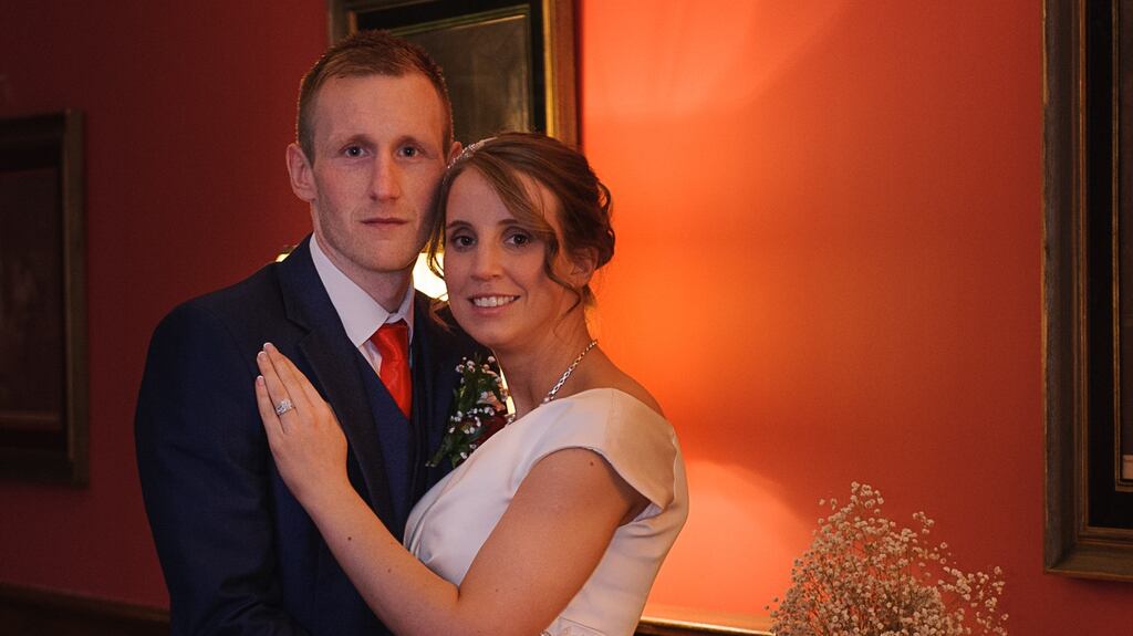 Amy, a Manchester United fan, wore red shoes with her dress from Memories Bridal on Parliament Street, Dublin. Her bridesmaid was her sister Sarah, who, according to their aunt Mary, “undertook the organising of the wedding and carried it out brilliantly”.