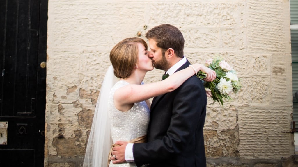 He commissioned a ring from jeweller Jen Cunningham, who incorporates landscapes into her work. “My ring is the landscape of Dundee in a mixture of yellow and white gold with three diamonds – representing past present and future – set in the ring like stars. I love it,” says Emma, the daughter of John and Catherine Hickey. The couple married on October 24th, 2015, the 10-year anniversary of their first date, in the Hotel du Vin, Edinburgh.