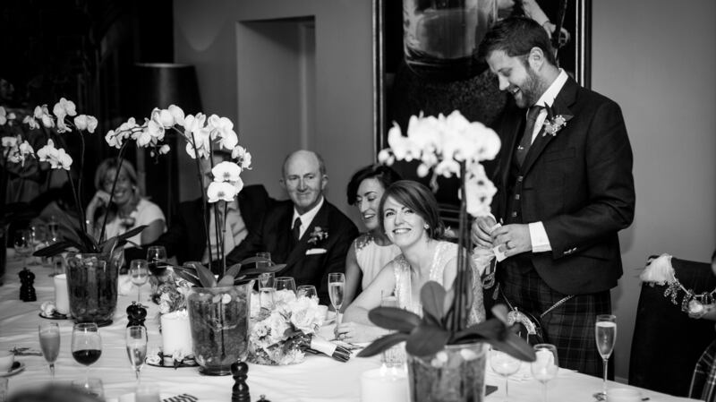 Emma, “frustrated by the over-the-top nature of wedding dresses”, found hers in Phase Eight’s Collection 8. Alex’s kilt and jacket was tailored for him on the Royal Mile in Edinburgh.