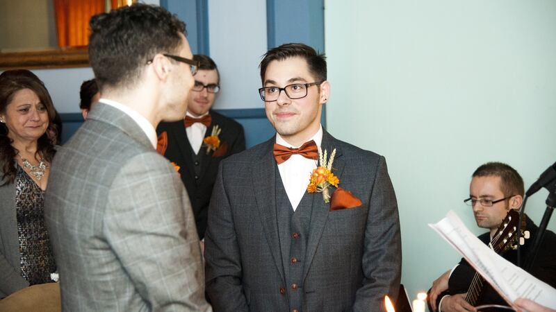 The grooms walked down the aisle to a piece Ray arranged for strings called Glass Vase Cello Case, by Tattle Tale. Both men wore suits from Tom Murphy's in Cork city and each was accompanied by a best man and and groomsmaid.