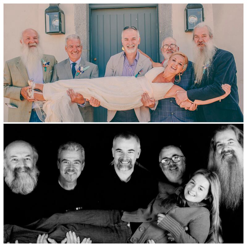 Her five uncles picked up the father-figure baton and have “been there for every special occasion”, even when Rebecca first met Padraig, in the car park at the base of Lugnaquilla mountain. The composition replicates a shot of the five uncles taken a decade earlier when Rebecca was a photography student at Griffith College.
