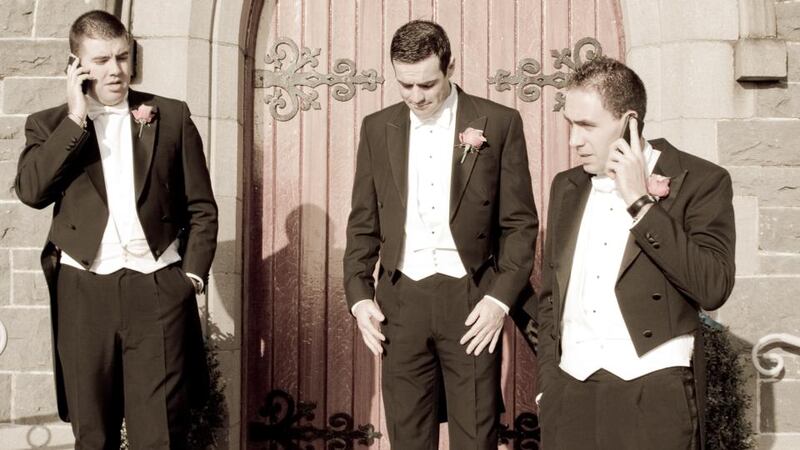 "That's me Domhnall Banks, the groom, in the middle, laughing to myself at the absurdity of what's going on. The best man (my brother Eoghan) is to the left of the shot and the groomsman, Colm Hanley, is to the right. Both are frantically calling whoever they can think of to try to locate our wedding rings. They had been given to my brother the previous evening for safe keeping, and they were so safe that he couldn't find them when we reached the church. After many calls, a bit of panic on his part, and plenty of slagging, they were found, in the lining of his jacket having fallen through a hole in the pocket of his tuxedo! It was an hilarious start to a great day."