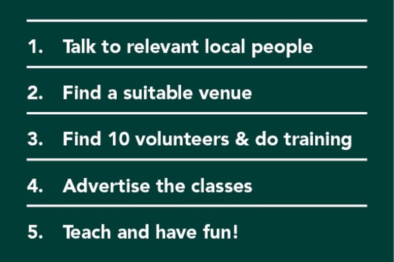 But the skills that volunteers need to bring are not really about teaching, as Horkan emphasises: “It’s more about making a connection with people. What you need are social skills . . . And you need to be happy to give some of your time to the community. Once it’s set up it really just takes you the one or two hours a week that you spend at the class. I get so much more out of it than the time I spend volunteering. In fact, it’s really good craic and doesn’t feel like volunteering at all. Now, my life wouldn’t be the same without it.”