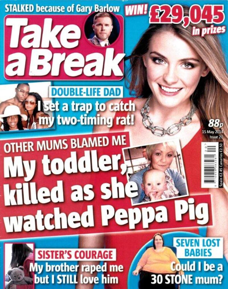 “My toddler, killed as she watched Peppa Pig,” is its big splash this week. Down the page: “Sister’s courage: My brother raped me but I STILL love him.”