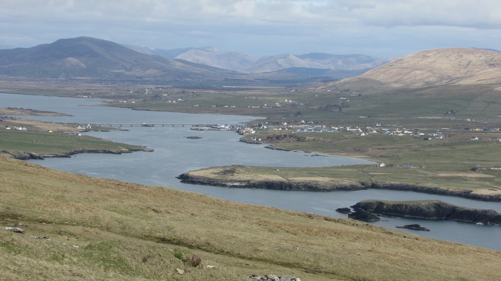 From here an expansive view opens northwards to the Blasket Islands and the gaping mouth of Ventry harbour with Mount Brandon poking its head into mist beyond. At the highest point the vista is directly ahead to Geokaun hill, the famous cliffs of Fogher and the pilgrim mountain of Cnoc na dTobar beyond.