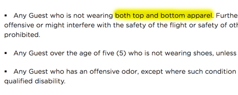 1. If you want to fly Virgin, you must be wearing "top and bottom apparel". Virgin's dress code is two lines long: "Any guest who is not wearing both top and bottom apparel" can be refused travel." Further, clothing that is offensive or might interfere with the safety of the flight or safety of other guests is prohibited."