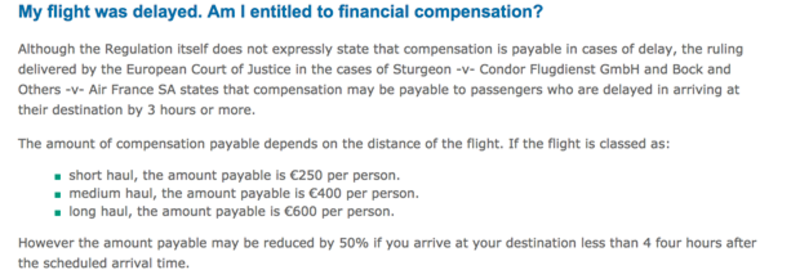 13. Delayed for more than three hours? Thanks to rule EU 261, you may be entitled to cash. For delays over three hours, except those caused by "extraordinary circumstances which could not have been avoided by reasonable measures", you are entitled to compensation of €250 per person on short-haul flights. For medium haul it's €400 and for long haul it's €600.