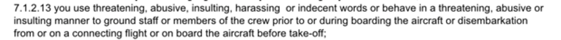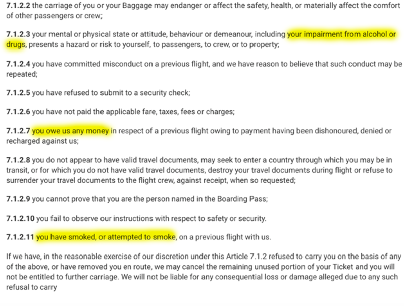 Ryanair’s comprehensive list of reasons a passenger can be refused carriage is similar to other airlines, among them misconduct, including being drunk or impaired by drugs; refusing to pay for your ticket; not having valid travel documents; and refusing to submit to a security check. It also states that “you owe us any money in respect of a previous flight” or “you cannot prove that you are the person named in the Boarding Pass”.
