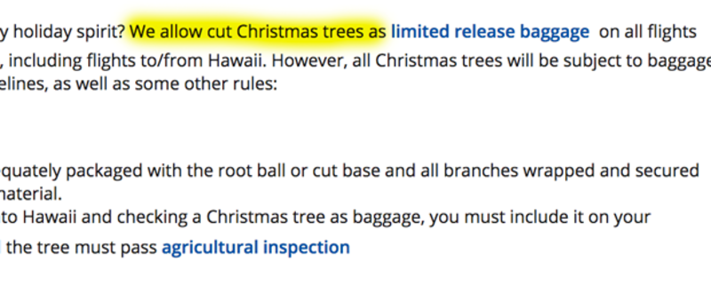 6. Attention Delta passengers: if you must travel with a Christmas tree, make sure you wrap it up. Delta might have strong views on slogan T-shirts, but is unfazed by passengers toting unconventional items on board. "Who are we to turn away holiday spirit?" the airline states. "We allow cut Christmas trees as limited release baggage on all flights . . . subject to baggage allowance and size guidelines."