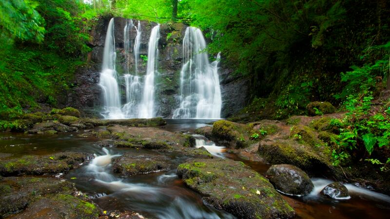 Understanding now why Glenariff is justifiably famous for its cascades, I passed a couple of tumultuous waterfalls before reaching the finest of the lot, the great double dip of the Ess-na-Larach or Mare’s Tail Falls.