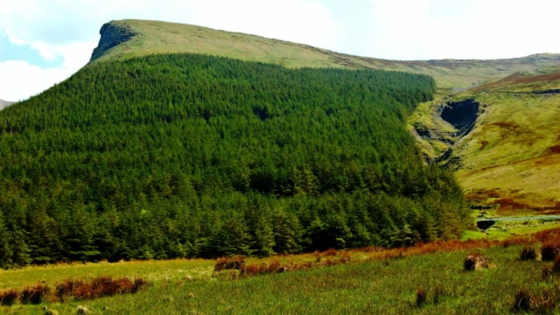 Truskmore (647m) is the highest point in Co Sligo while a few hundred metres away a cairn on the 650m contour line marks the highest point in Co Leitrim. Now I think that a beautiful county like Leitrim deserves more than a quick stroll across to a nondescript nameless cairn on the edge of the Truskmore Plateau. So I decided that Tievebaun (611m), which is the highest spot height in Leitrim, would be my first objective of the day. From the car park a forest road zigzags up the steep wooded slopes of the Dartry Plateau’s southern edge to a clearing where a stile brings you on to the bog road. The track gets you easily through the worst of the cutaway bog and up to 350m before you have to venture on to the rough ground of the open moorland.