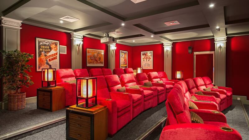 On the lower ground-floor level is the private swimming pool with hand-painted murals and its own swim-up bar, lit by a twinkling sky full of tiny stars created by some subtle ambient lighting – obviously. There’s a gym and private spa, games room and a wine cellar and the house also has a lush, red velvet-upholstered movie theatre with reclining chairs, digital screen and a Bose surround-sound system.