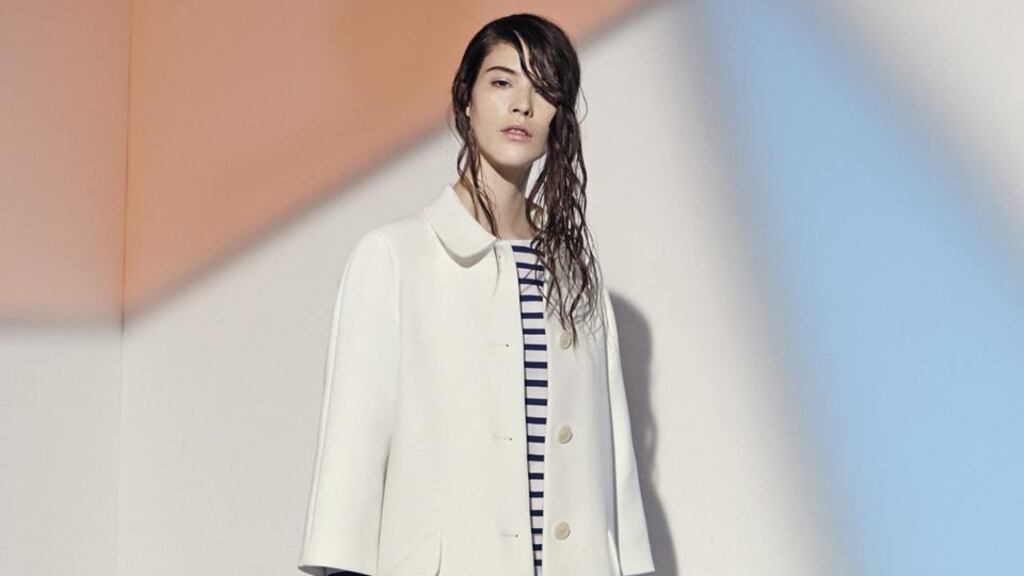 Its familiar winter tea dresses, reefer jackets and tweeds have been replaced by summery, printed maxis; pinafores; parkas and their familiar tailored coats and jackets. This coat, for instance, called Grace, is €260, stripe top €45.