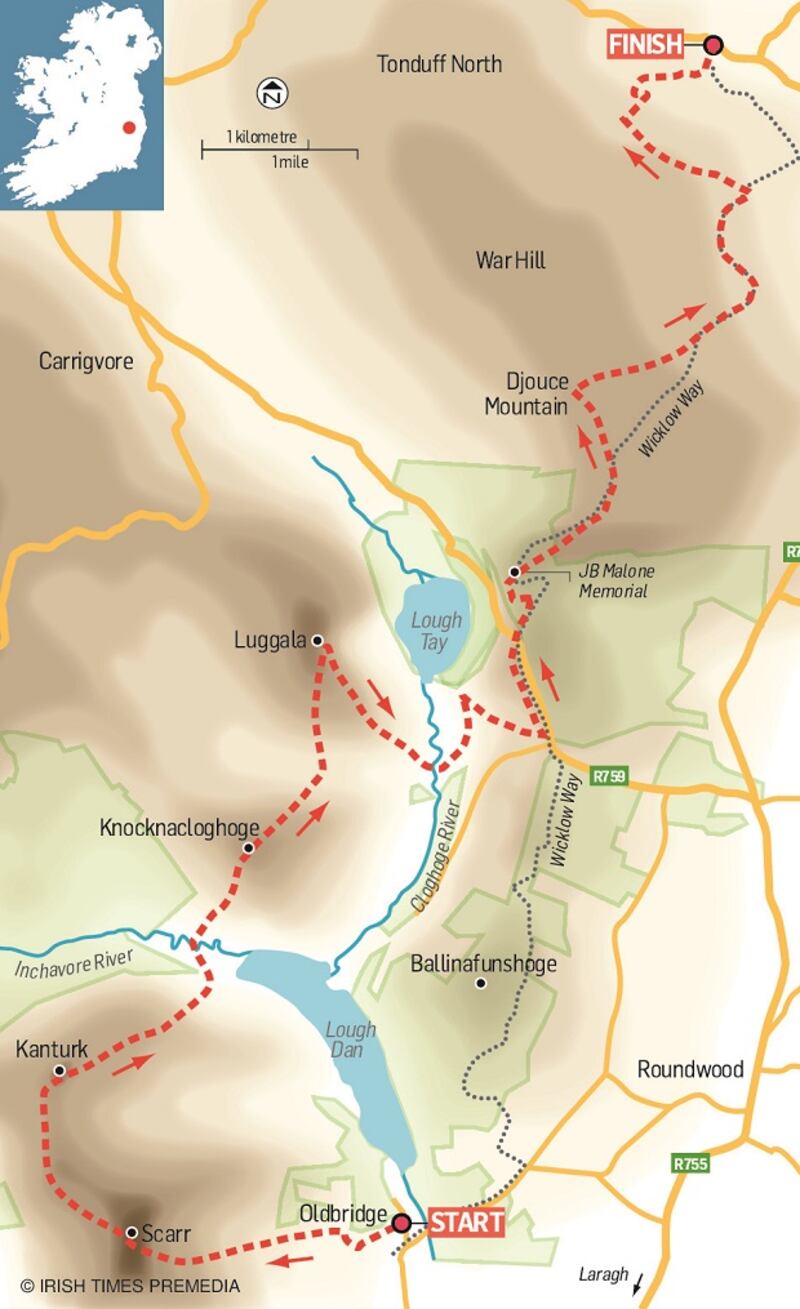That said, this linear walk takes in six of the most beautifully situated hills in Wicklow (Scarr, Kanturk Mountain, Knocknacloghoge, Luggala, Djouce and Maulin) and four of the county’s loveliest valleys. It’s about 23km in length and 1,800m of climbing, and takes about nine hours. The wind direction usually demands we do it south to north, as we did on this lovely spring day.