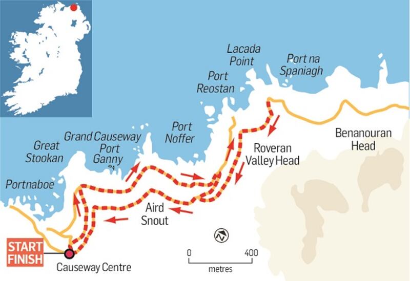 It is a disturbing thought as I return along the clifftop passing above the Shepherd’s Steps in the gathering dusk with the lights of Portrush firing up the horizon. Pausing over the black basalt columns, it occurs to me that here is by far Ireland’s most insanely evocative coastline. This means, of course, that I must take back something I said earlier for I don’t really dislike the causeway. Actually, I love its surreal atmosphere – it’s just the crowds I can’t abide.