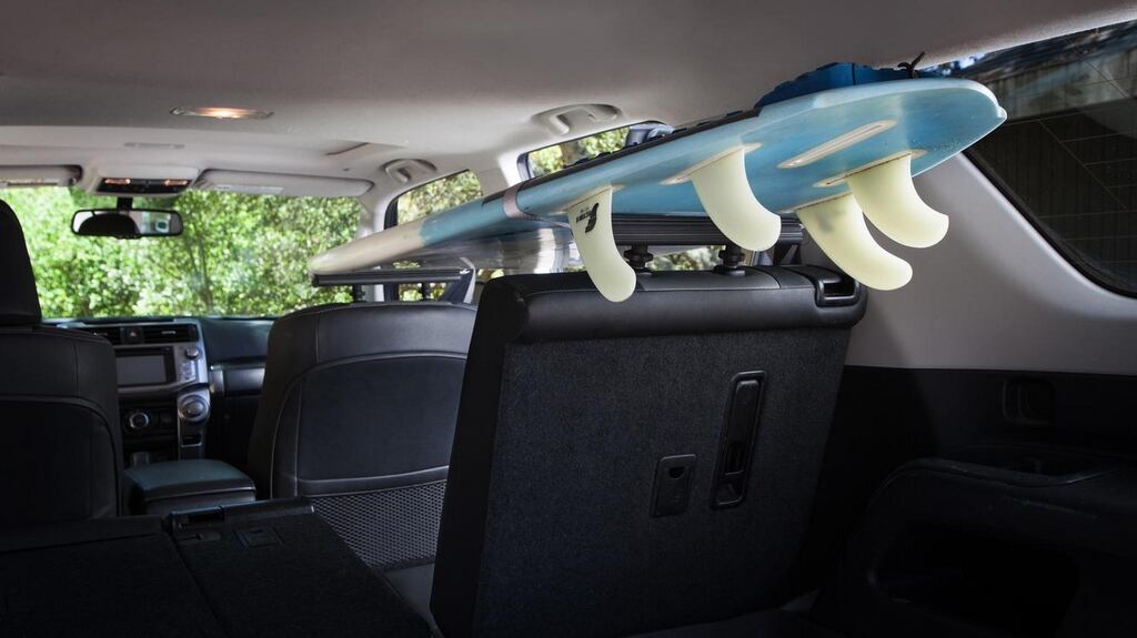 Positioned as an alternative to roof racks with their wind noise and reduced fuel efficiency, SeatRack brings its own set of compromises, not least of which is taking up two seat places. It works by using the head rest slots to install an interior rack which can carry long items, such as surfboards and skis, and strap them securely in place. The post width is adjustable, with sleeves to assure a snug fit. $129 from seat-rack.com