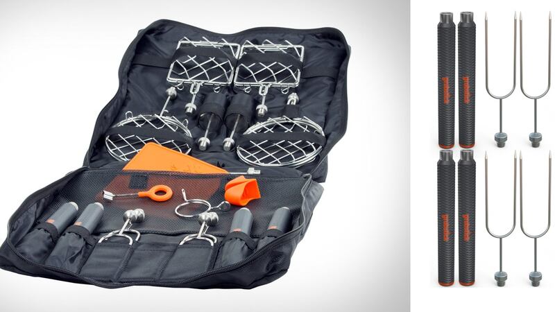 If the idea of sausages-on-a-branch campfire cooking is just a little too rough and ready, you could tool-up with Grubstick’s Master Outdoor Cooking Kit. It comes in its own canvas bag, with a selection of stainless steel implements for some conservative open-flame grilling. The basic unit is a telescopic (oh yes) handle which can be fitted with a fork, burger cage or a pair of tubes for outdoors baking. A couple of grips help avoid second-degree burns. All this nanny-stating comes at a price, of course. $140, see grubstick.com