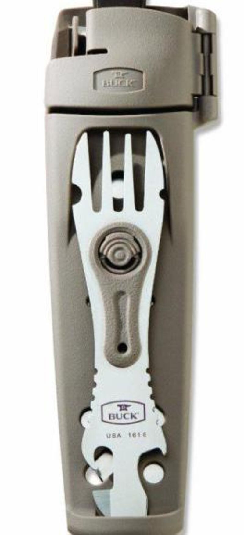 Not exactly pocket-sized, the US-made Buck TravelMate "slices, dices, spreads and serves". There's a flathead screwdriver in there, as well as can and bottle openers, a BBQ scraper, a fork and a serrated knife that's wide and bendy for easy spreading. It's all held in a sheath with an antimicrobial finish to keep bacteria at bay, although it is also dishwasher-safe. Not that you'll necessarily have one of those with you camping.