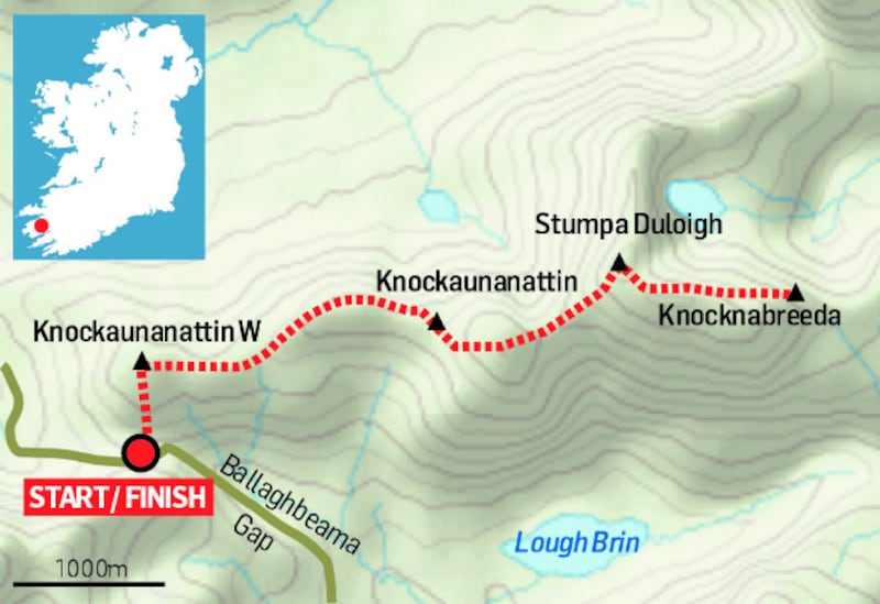 Map: Ordnance Survey. Discovery Series. Sheet 78. Or Macgillycuddy's Reeks 1:25.000. (Peaks named) Start and Finish: The car park at the high point of the Ballaghbeama Gap.
