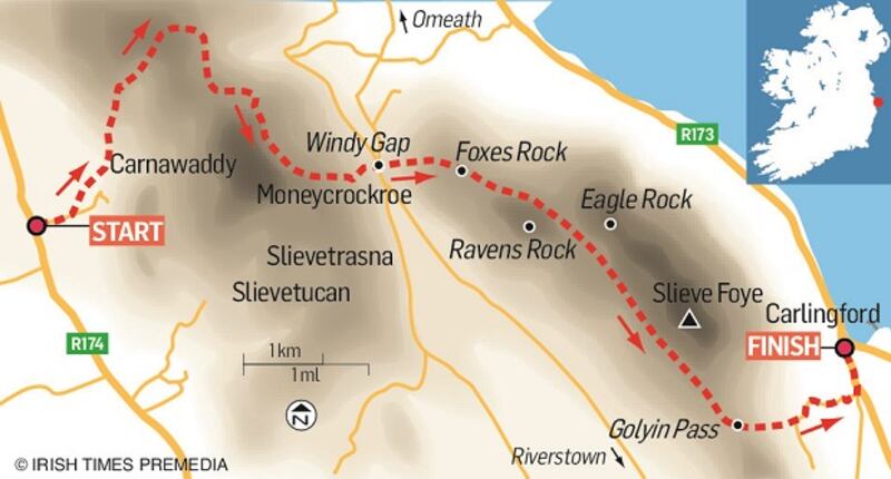 Start: Ravensdale Bridge on R174 19km from Greenore (alternative start Lumpers Pub parking at Ravensdale, follow Tain Way to pass at 430m, then to Clermont)