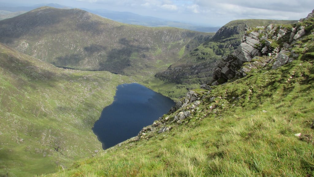 Saving the best wine for last, I strike out almost due north to reach cliffs above the col lying east of the Punch Bowl. Now I have a first glimpse of the declivities that tumble vertiginously into Glenacappul, the queen of Kerry’s glaciated valleys. For a time I stand transfixed above its 300-metre cliffs and marvel at the stupendous forces required to carve out such an abyss. Below are the still waters of Lough Erhogh reflecting a sapphire sky.