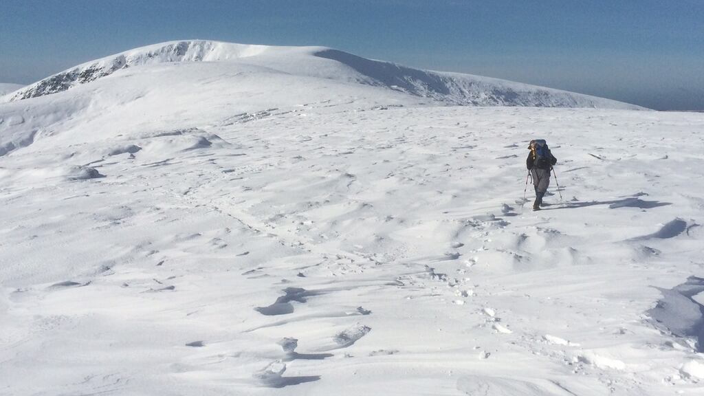 When our (more benign) snow comes, hikers’ imaginations conjure up the magic of dramatically transformed mountain landscapes, the crunch of snow under boots and the possibility of a cheap and accessible “alpine” experience. And high Lugnaquilla, with its promise of the coldest and snowiest conditions usually calls loudest. And so it did for us on a sparkling mid-February day. A strong ridge and its preceding northerly airflow had nudged a plume of heavy, slow-moving snow showers offshore and a dream day of dry, clear and calm conditions was promised.