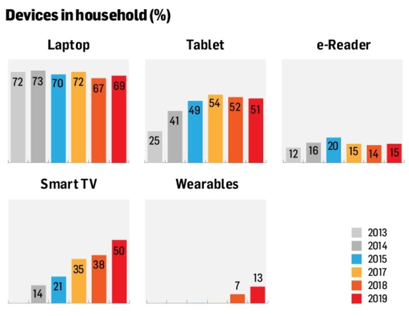 Despite some recent negative publicity Facebook has been attracting, our usage of it is unabated: the average user spends 10 hours a week on it, up from eight hours on the previous survey. We're streaming, sharing, shopping, swiping, liking, clicking, chatting, connecting, emailing, dating, downloading, catching up, researching, following and gaming like never before.