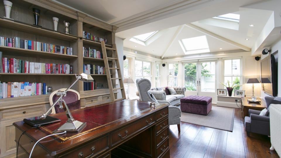 Downstairs, there is a large family room that shares the space with a selection of gym equipment conveniently out of sight if you’re lying prone on the sofa. Fold-back doors open into a large playroom where double-doors lead outside to the courtyard. This could also be a fourth bedroom. To its rear is another double bedroom with an en suite bathroom that would suit a live-in au pair.