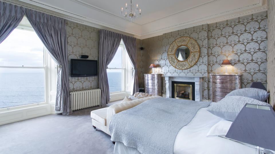 The master bedroom is probably the best room in the house. It has ornate ceiling cornicing and a marble open fireplace. The views from the bed stretch across Dublin Bay.