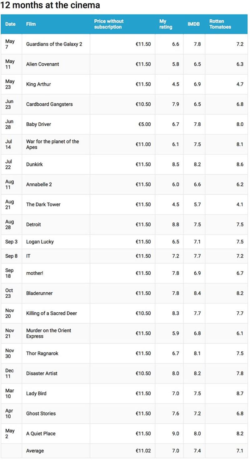 In May, I saw my last film of the year. A Quiet Place, John Krasinski’s exquisitely tense horror debut, was incredible. At 9.0, it earned the highest rating of the year, followed by Detroit (8.8) and Dunkirk (8.5). It ended the experiment on a high. It also massaged the stats late in the game.