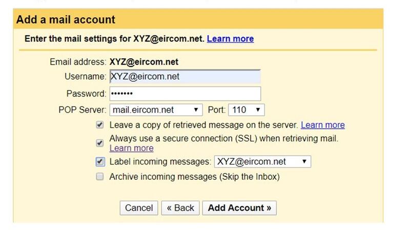 Then enter your eircom.net account details and click “next”. You should then follow the on-screen detail by clicking “next” until you get to the screen below and fill in the details using your actual email address in place of the XYZ. Change other details so they match the below.