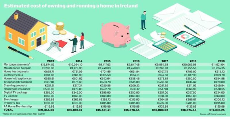 According to the insurance intermediary the cost of running a home in Ireland is now a very precise €17,393.25, a significant increase from last year's calculation of €16,374.45 which is approximately 44 per cent of the current average Irish national wage.
