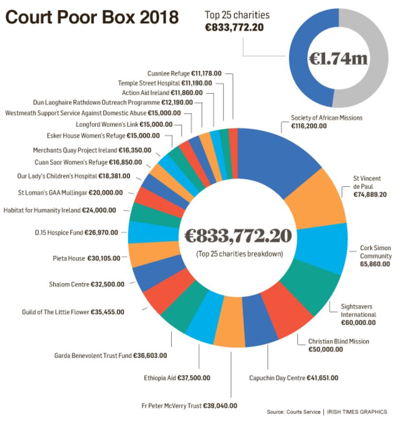 Almost €1.74 million was paid out from the court poor box to various charities in 2018, according to figures released by the Courts Service.
