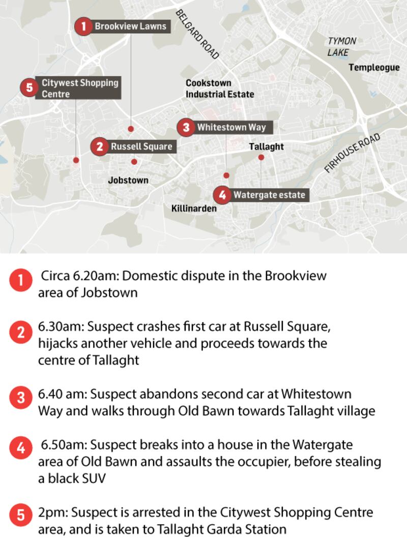 He was eventually caught yesterday afternoon after the final car he used was disabled by Garda intervention and he ran through the crowded Citywest Shopping Centre with his firearm.