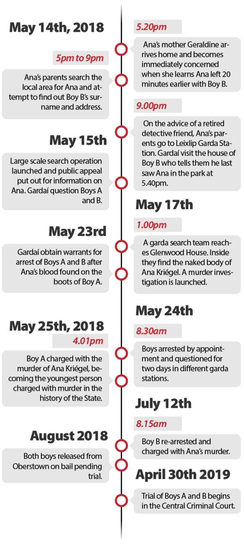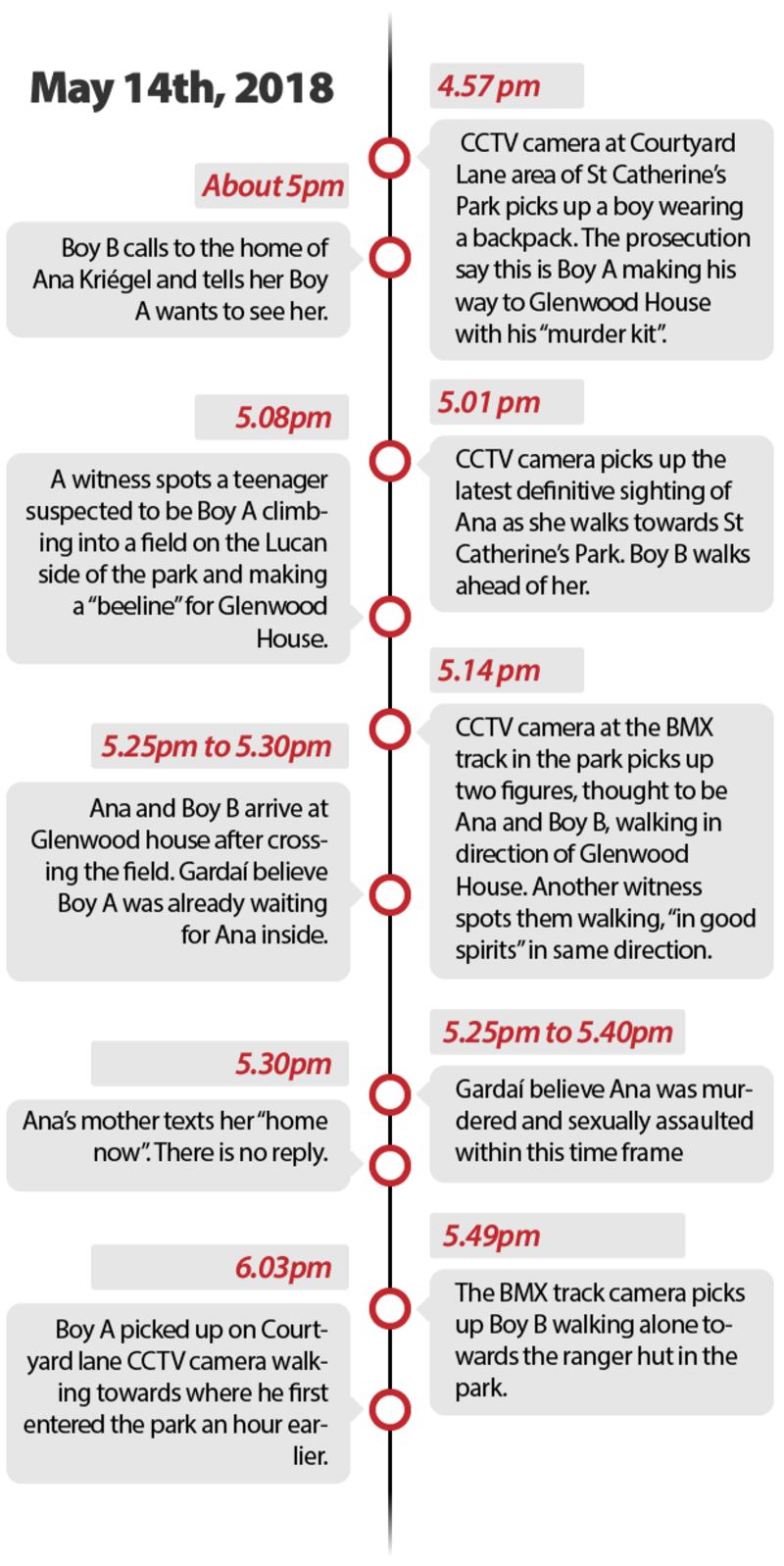 Boy B took a deep breath before telling gardaí that Boy A went into the house with Ana. “I left, and that’s when I heard the scream, and then I ran,” he said. “It was a really strong scream. I knew that it was Ana, but since [Boy A] was there she’d be fine. He’d protect her. The scream was, like, really loud. Just before it ended it got muffled, like someone covered her mouth.”