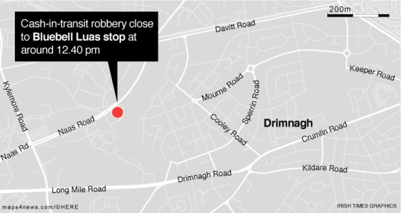 The van was held up at the Blue Bell Luas stop at 12.40pm and a cash box was taken. Gardaí are currently at the scene.