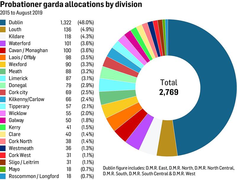 Of the 28 Garda divisions, the six in Dublin have received 48 per cent of the 2,769 Garda recruits to pass out from Templemore since recruitment to the force recommenced five years ago. The remaining 22 divisions across the country shared the other 52 per cent of the recruits.
