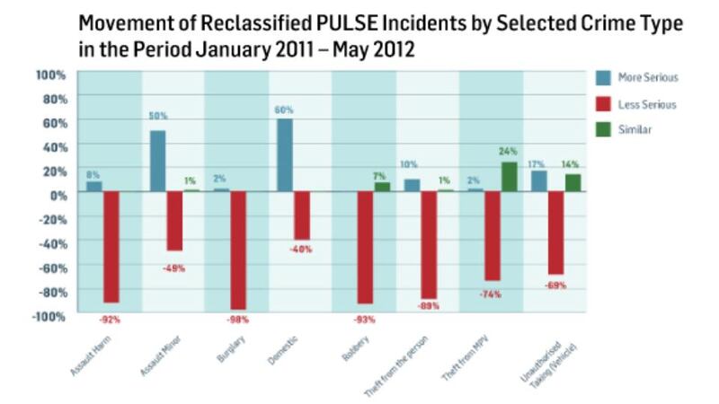 The amount of crimes that were reclassified as a less serious offence. Some 25,588 crimes were identified as reclassified, which amounts to 8.5 per cent of total crime recorded on Pulse during the 12-month period. The inspectorate examined 12,506 crimes that were reclassified on Pulse across all divisions from January 2011 to May 2012. In 83 per cent of cases, the chart shows a reclassification resulted in a crime moving to a less serious offence and in 13 per cent of cases, the crime went to a more serious crime type.