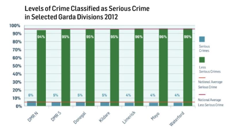 The number of gardaí working in regular units, but investigating the vast majority of crimes that take place in a division. An average of 12 per cent of members are assigned to detective duties and a further 5 per cent to drugs units and taskforces, but these units are not investigating an equal proportion of crime.