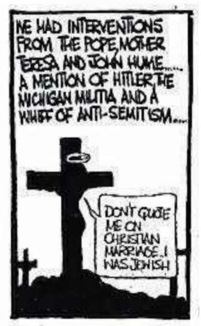 My crime was to draw a cartoon about the divorce referendum. The Labour Party had chosen Mervyn Taylor to lead the campaign on behalf of those devils seeking divorce. Mr Taylor is, culturally, Jewish.
