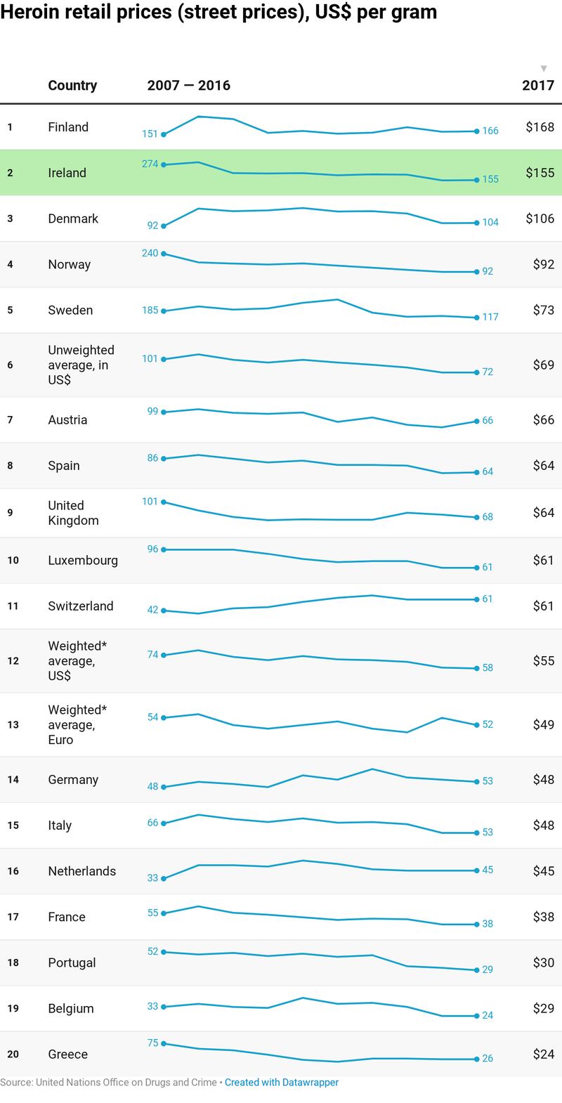 Data from previous years shows the street price of heroin in Ireland has remained among the highest in Europe. The cost peaked in 2008 when a gram on Irish streets reportedly cost $294 (€259) before dropping to $209 (€184) the following year. The cost of street heroin in Ireland has ranged around $155 (€136) since 2015, according to the UN study.