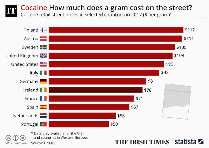The street price of cocaine in Ireland was much closer to the European average of $82 (€72) with a gram of cocaine costing $78 (€69) on Irish streets in 2017. The Irish street cost of cocaine has dropped since 2008 when it peaked at $103 (€91). The most expensive country to buy cocaine in western and central Europe in 2017 was Finland followed by Luxembourg and Sweden. The cheapest street price for cocaine was in Portugal where a gram cost $50 (€43). The average street cost of a gram of cocaine across Europe was $82 (€72).