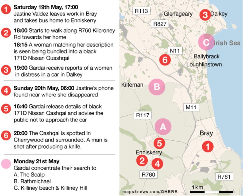 Ms Valdez has been studying in Tallaght and had a part-time job in a restaurant in Bray. She regularly walked on the stretch of road where her apparent abduction was witnessed.