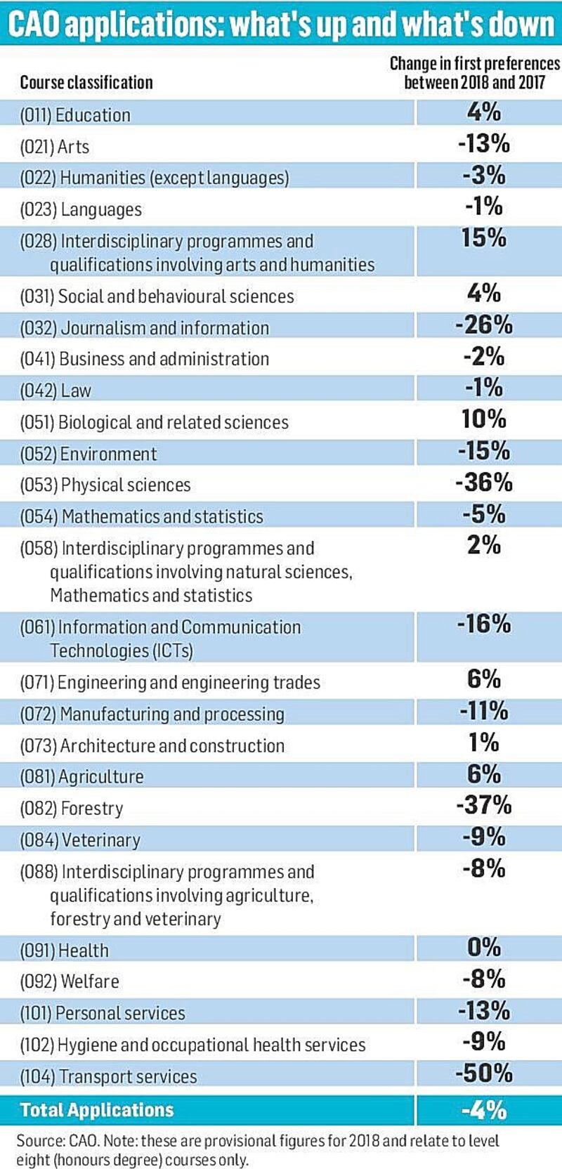 The sharpest year-on-year drops in first preferences were in areas such as physical sciences or chemistry (-36 per cent), journalism and information (-26 per cent), ICT (-16 per cent), environment (-15 per cent) and arts (-13 per cent).