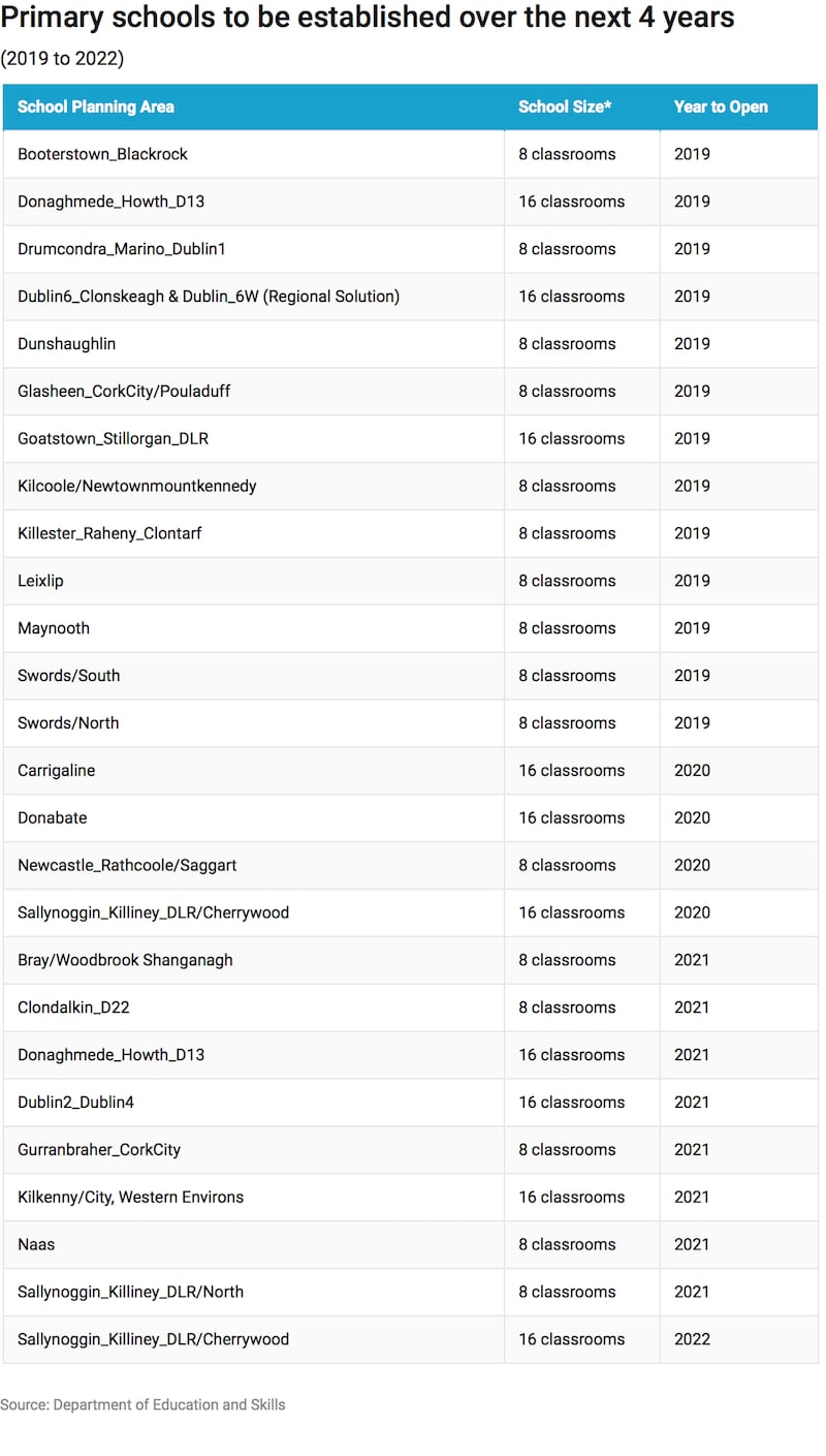 In general, most new schools will be established on sites that are owned or bought by the State, while patron bodies be responsible for running them. Parents in areas where the 44 schools are due will be given a chance to register their preferred patron body through a new online system, and to express their preference of education through English or Irish.