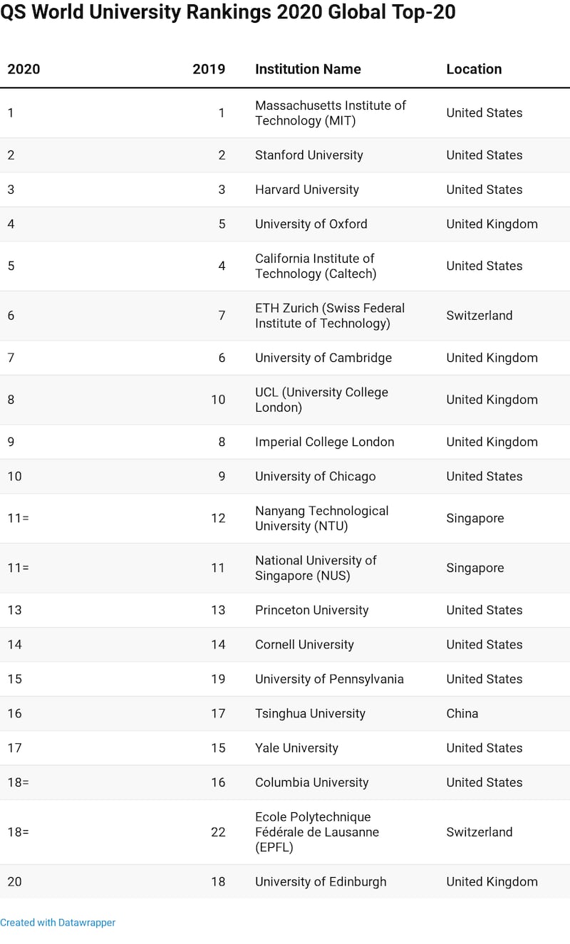 Massachusetts Institute of Technology is named the world number one for a record eighth consecutive year. The top place in Europe is retained by the University of Oxford (fourth, up one place).
