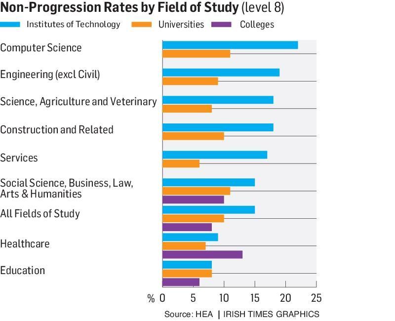 This compared to lower rates in honours degree courses at institutes of technology (15 per cent), universities (10 per cent) and smaller colleges (8 per cent).