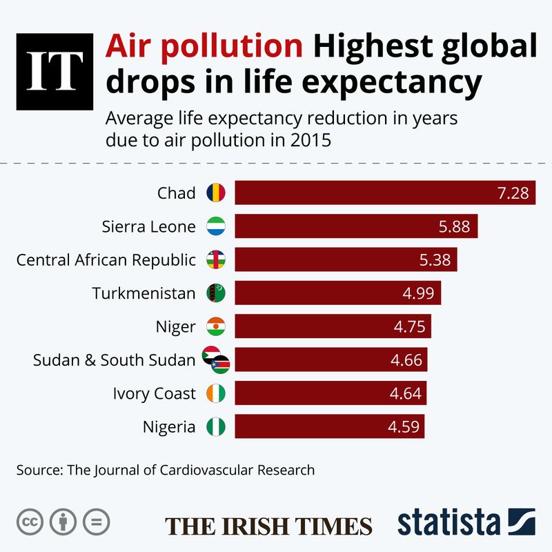 By comparison, tobacco smoking shortens life expectancy by an average of 2.2 years, HIV/Aids by 0.7 years, diseases like malaria that are carried by parasites or insects such as mosquitoes, ticks and fleas by 0.6 years, and all forms of violence - including deaths in wars - by 0.3 years, the authors wrote in their new paper, published in the journal Cardiovascular Research.