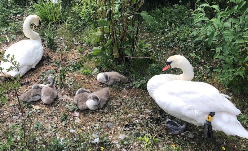 These are the cygnets, with their parents, hatched by the swan featured on her nest by the Dodder in Eye on Nature on May 5th. – Ronan Copeland, Sandymount, Dublin
