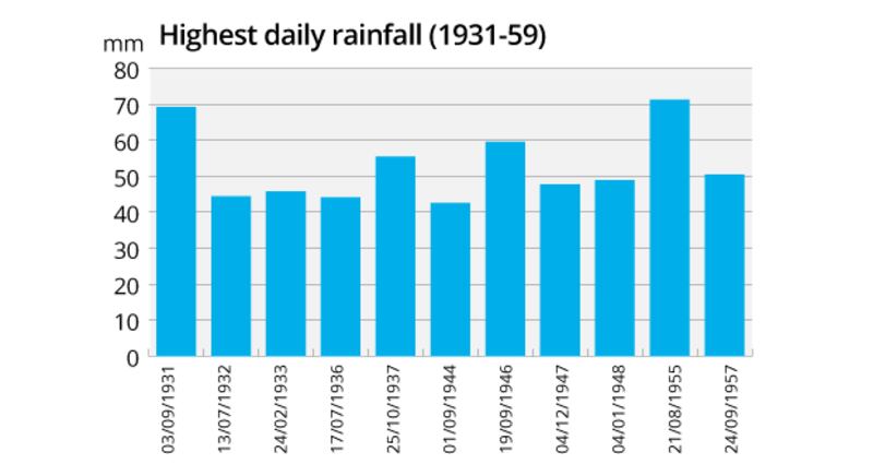 It looked at heavy rainfall and found the wettest day of its sample period (71.3mm of rain) was on August 21st, 1955.